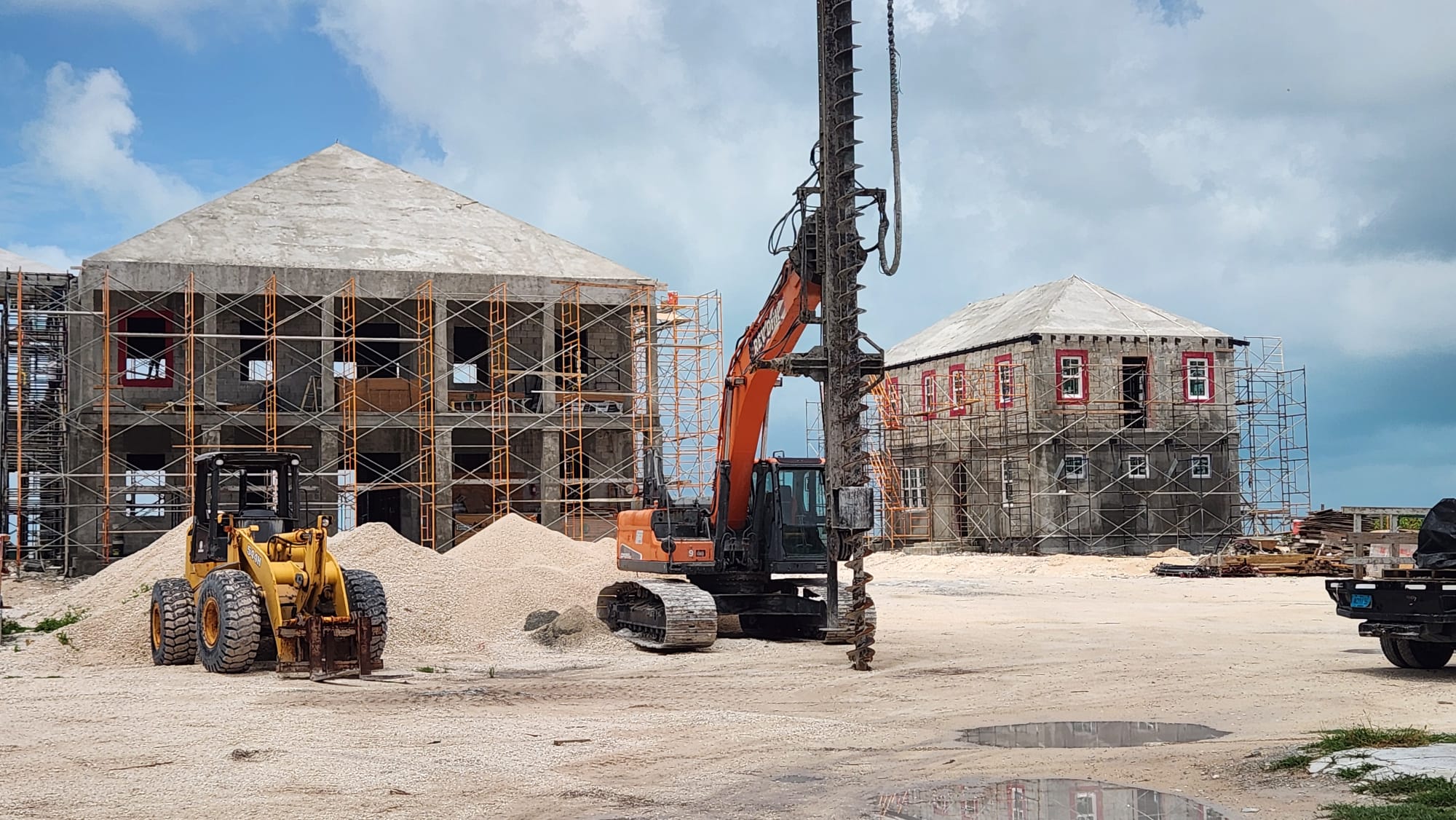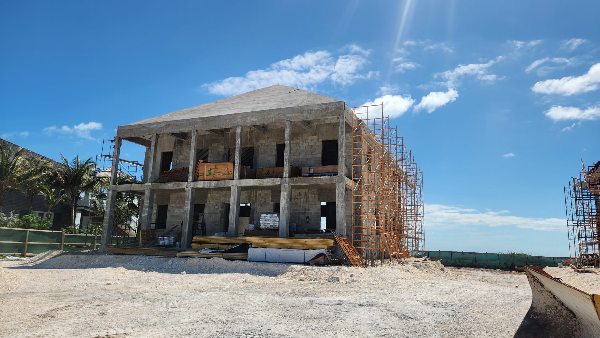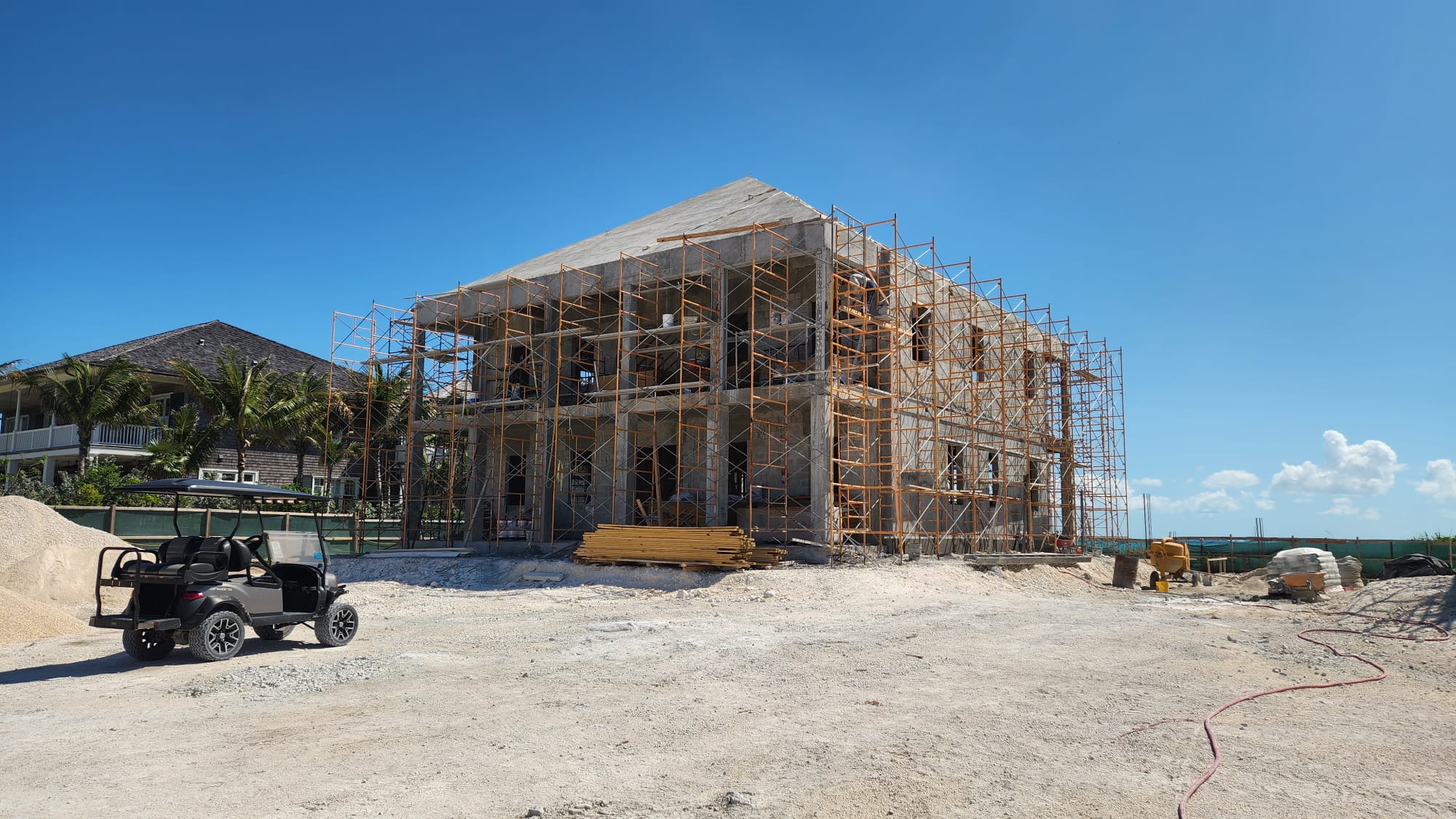 Bluewater Developers logo with a stylized fish design in blue and yellow. Text reads, "Bluewater Developers, Bahamas: 242-809-3381.